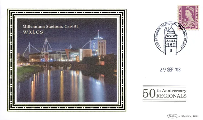 The above Royal Mail Country Definitives: Miniature Sheet were issued on 29 September 2008 by Royal Mail and feature the following stamp designs: 9 x 1st Decimal Reprints of 1958 Regional stamps. The Millennium Stadium, Cardiff first day cover with the Cardiff, Castle Tower - changeable date, Special Handstamp postmark has been produced by Benham and features these stamps which can make a very collectible and lovely gift.