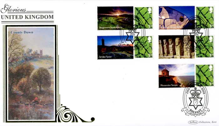 The above Royal Mail Glorious United Kingdom: Generic Sheet were issued on 29 September 2008 by Royal Mail and feature the following stamp designs: 1st England, 1st Northern Ireland, 1st Scotland, 1st Wales plus labels. The County Down first day cover with the Belfast, Red Hand of Ulster, Special Handstamp postmark has been produced by Benham and features these stamps which can make a very collectible and lovely gift.