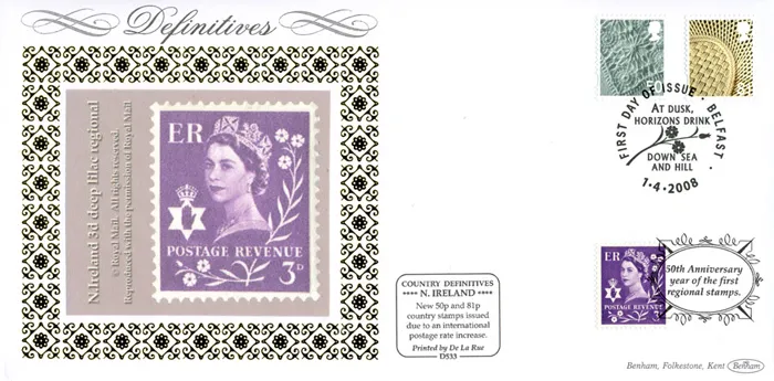 The above Royal Mail Northern Ireland 50p, 81p were issued on 01 April 2008 by Royal Mail and feature the following stamp designs: . The Original 3d Lilac first day cover with the Belfast, At Dusk, Horizons Drink Down Sea and Hill, Special Handstamp postmark has been produced by Benham and features these stamps which can make a very collectible and lovely gift.
