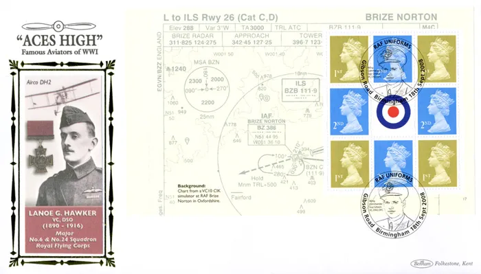 The above Royal Mail PSB: RAF Uniforms - Pane 3 were issued on 18 September 2008 by Royal Mail and feature the following stamp designs: . The Lanoe Hawker, VC, DSO first day cover with the Birmingham, Gibson Road, Special Handstamp postmark has been produced by Benham and features these stamps which can make a very collectible and lovely gift.