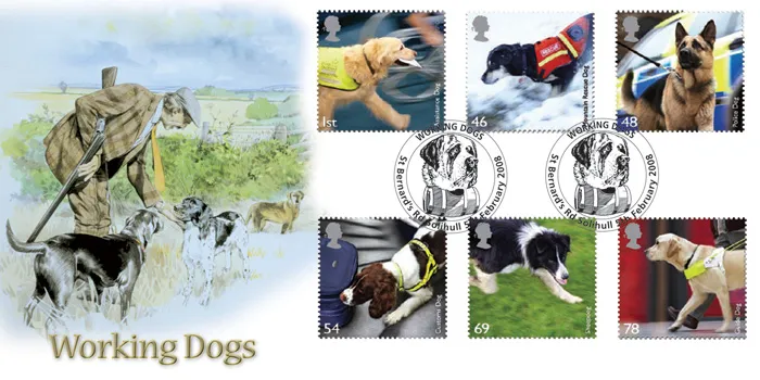 The above Royal Mail Working Dogs were issued on 05 February 2008 by Royal Mail and feature the following stamp designs: 1st Assistance Dog; 46p Mountain Rescue Dog; 48p Police Dog; 54p Customs Dog; 69p Sheepdog; 78p Guide Dog.. The Gun Dogs first day cover with the Solihull, St Bernard's Road, Special Handstamp postmark has been produced by Bradbury and features these stamps which can make a very collectible and lovely gift.