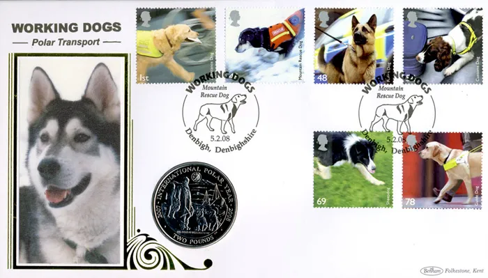 The above Royal Mail Working Dogs were issued on 05 February 2008 by Royal Mail and feature the following stamp designs: 1st Assistance Dog; 46p Mountain Rescue Dog; 48p Police Dog; 54p Customs Dog; 69p Sheepdog; 78p Guide Dog.. The Polar Transport first day cover with the Denbigh, Mountain Rescue Dog, Special Handstamp postmark has been produced by Benham and features these stamps which can make a very collectible and lovely gift.