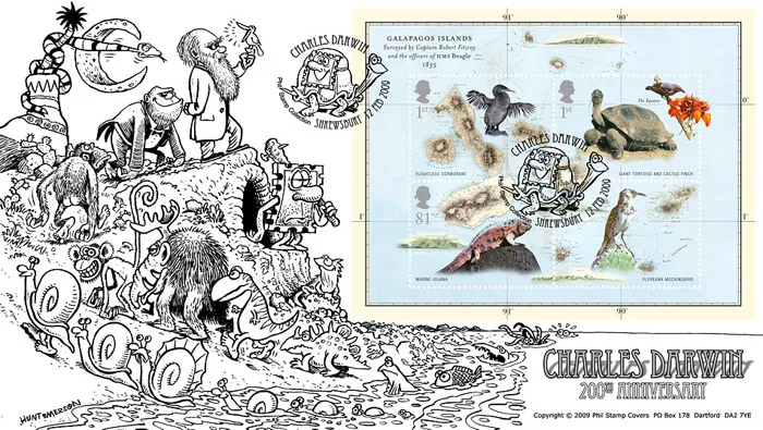 The above Royal Mail Charles Darwin: Miniature Sheet were issued on 12 February 2009 by Royal Mail and feature the following stamp designs: 1st Flightless Cormorant; 1st Giant Tortoise and Cactus Finch; 81p Marine Iguana; 81p Floreana Mockingbird. The Evolution first day cover with the Shrewsbury, Tortoise, Special Handstamp postmark has been produced by Steve Oliver and features these stamps which can make a very collectible and lovely gift.