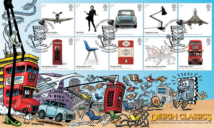 The above Royal Mail Design Classics were issued on 13 January 2009 by Royal Mail and feature the following stamp designs: 1st Supermarine Spitfire; 1st Mini Skirt; 1st Mk1 Austin Mini; 1st Anglepoise Lamp; 1st Concorde; 1st K2 Telephone Kiosk; 1st Polypropylene Chair; 1st Penguin Books; 1st London Underground Map; 1st Routemaster Bus. The Mad Designs first day cover with the London, Strand - Bowler and Umbrella, Special Handstamp postmark has been produced by Steve Oliver and features these stamps which can make a very collectible and lovely gift.