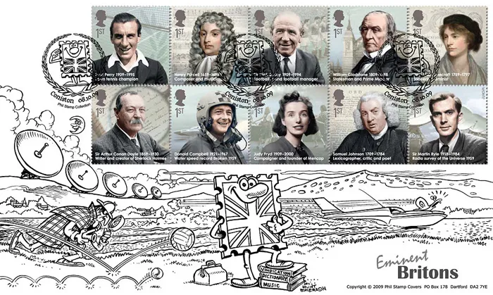 The above Royal Mail Eminent Britons were issued on 08 October 2009 by Royal Mail and feature the following stamp designs: 1st Fred Perry; 1st Henry Purcell; 1st Sir Matt Busby; 1st William Gladstone; 1st Mary Wollstonecraft; 1st Sir Arthur Conan Doyle; 1st Donald Campbell; 1st Judy Fryd; 1st Samuel Johnson; 1st Sir Martin Ryle. The Bluebird first day cover with the Coniston, Laurel Leaves, Special Handstamp postmark has been produced by Steve Oliver and features these stamps which can make a very collectible and lovely gift.