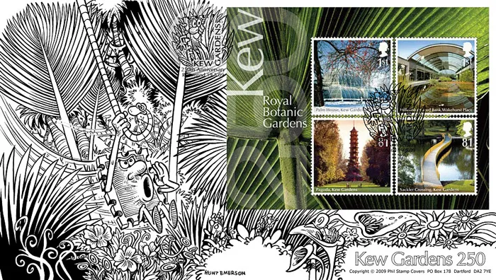 The above Royal Mail Plants: Miniature Sheet were issued on 19 May 2009 by Royal Mail and feature the following stamp designs: 1st Palm House; 1st Millennium Seed Bank;; 90p Pagoda; 90p Sackler Crossing. The Phil Stamp in Jungle first day cover with the Kew Gardens, Special Handstamp postmark has been produced by Steve Oliver and features these stamps which can make a very collectible and lovely gift.