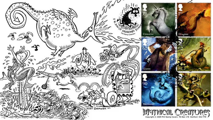The above Royal Mail Mythical Creatures were issued on 16 June 2009 by Royal Mail and feature the following stamp designs: 1st Unicorns; 1st Dragons; 62p Giants; 62p Pixies; 90p Mermaids; 90p Fairies. The Dragon first day cover with the Dragonby, Scunthorpe, Burnt Dragon, Special Handstamp postmark has been produced by Steve Oliver and features these stamps which can make a very collectible and lovely gift.