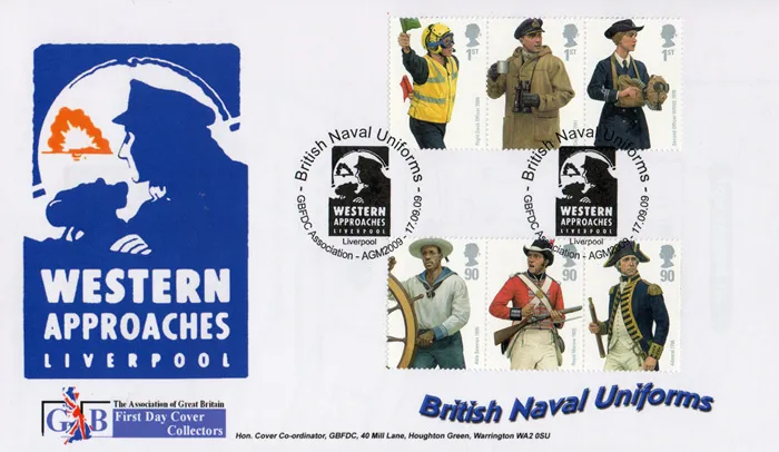 The above Royal Mail Navy Uniforms were issued on 17 September 2009 by Royal Mail and feature the following stamp designs: 1st Flight Deck Officer 2009; 1st Captain 1941; 1st Second Officer WRNS 1918; 90p Able Seaman 1880; 90p Royal Marines 1805; 90p Admiral 1795. The Western Approaches first day cover with the Liverpool, Lookout duty, Special Handstamp postmark has been produced by Assoc of GBFDC and features these stamps which can make a very collectible and lovely gift.