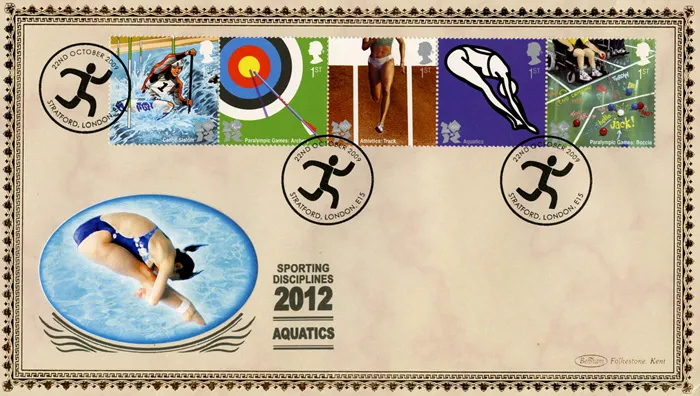 The above Royal Mail Olympic Games: Series No.1 were issued on 22 October 2009 by Royal Mail and feature the following stamp designs: 1st Canoe Slalom; 1st Paralympic Games: Archery; 1st Athletics: Track; 1st Aquatics; 1st Paralympic Games: Boccia; 1st Judo; 1st Paralympic Games: Equestrian; 1st Badminton; 1st Weightlifting; 1st Basketball. The Aquatics first day cover with the Stratford London, Runner, Special Handstamp postmark has been produced by Benham and features these stamps which can make a very collectible and lovely gift.