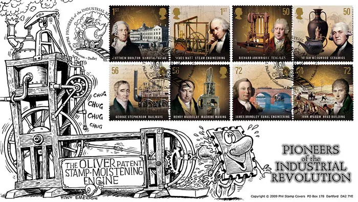 The above Royal Mail Pioneers of the Industrial Revolution were issued on 10 March 2009 by Royal Mail and feature the following stamp designs: 1st Matthew Boulton; 1st James Watt; 50p Richard Arkwright; 50p Josiah Wedgwood;; 56p George Stephenson; 56p Henry Maudslay; 72p James Brindley; 72p John McAdam. The Stamp Moistening Engine first day cover with the Dudley, Tea Pot, Special Handstamp postmark has been produced by Steve Oliver and features these stamps which can make a very collectible and lovely gift.