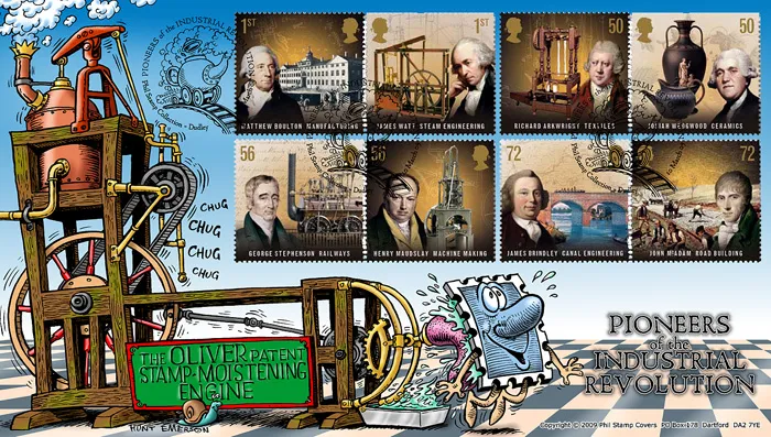 The above Royal Mail Pioneers of the Industrial Revolution were issued on 10 March 2009 by Royal Mail and feature the following stamp designs: 1st Matthew Boulton; 1st James Watt; 50p Richard Arkwright; 50p Josiah Wedgwood;; 56p George Stephenson; 56p Henry Maudslay; 72p James Brindley; 72p John McAdam. The Stamp Moistening Machine - Patent Pending first day cover with the Dudley, Teapot on wheels, Special Handstamp postmark has been produced by Steve Oliver and features these stamps which can make a very collectible and lovely gift.