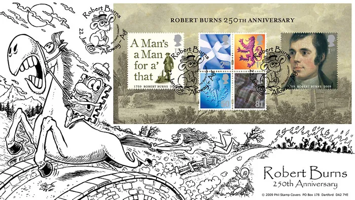 The above Royal Mail Robert Burns: Miniature Sheet were issued on 22 January 2009 by Royal Mail and feature the following stamp designs: 1st A Man's a Man for a' that; 1st Burns Portrait; 2nd Scottish Flag; 1st Scottish Lion; 50p Thistle; 81p Tartan. The Tam O'Shanter first day cover with the Alloway, Mouse, Special Handstamp postmark has been produced by Steve Oliver and features these stamps which can make a very collectible and lovely gift.