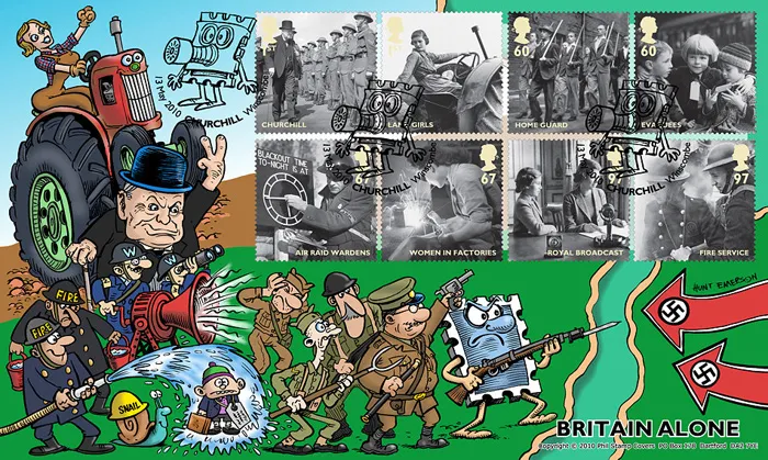 The above Royal Mail Britain Alone were issued on 13 May 2010 by Royal Mail and feature the following stamp designs: 1st Churchill; 1st Land Girls; 60p Home Guard; 60p Evacuees; 67p Air Raid Wardens; 67p Women in Factories; 97p Royal Broadcast; 97p Fire Service. The Dad's Army first day cover with the Churchill, Gas Mask, Special Handstamp postmark has been produced by Steve Oliver and features these stamps which can make a very collectible and lovely gift.