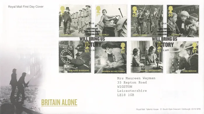 | Stamp Details: | 1st Churchill 1st Land Girls 60p Home Guard 60p Evacuees 67p Air Raid Wardens 67p Women in Factories 97p Royal Broadcast 97p Fire Service |