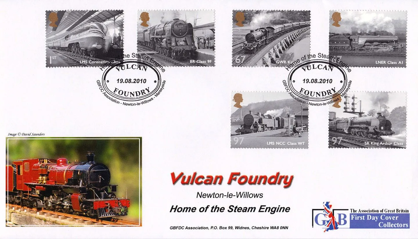 The above Royal Mail Great British Railways were issued on 19 August 2010 by Royal Mail and feature the following stamp designs: 1st LMS Coronation Class; 1st BR Class 9F; 67p GWR King Class; 67p LNER Class A1; 97p SR King Arthur Class; 97p LMS NCC Class WT. The Vulcan Foundry first day cover with the Newton-le-Willows, Vulcan Foundry, Special Handstamp postmark has been produced by Assoc of GBFDC and features these stamps which can make a very collectible and lovely gift.
