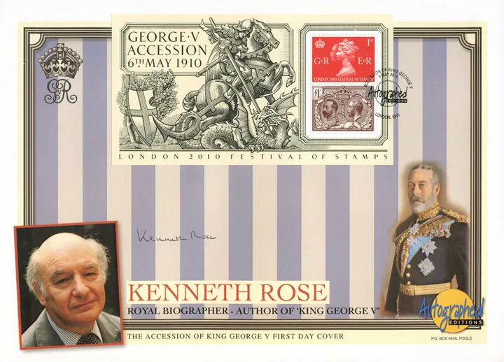 The above Royal Mail King George V: Miniature Sheet were issued on 06 May 2010 by Royal Mail and feature the following stamp designs: 1st Queen Elizabeth & King George V; £1 King George V Downey and Mackennal Heads. The Kenneth Rose first day cover with the London SW1, Autographed Editions, Special Handstamp postmark has been produced by Westminster and features these stamps which can make a very collectible and lovely gift.