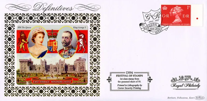 The above Royal Mail King George V: 1st Sheet Format were issued on 06 May 2010 by Royal Mail and feature the following stamp designs: Queen Elizabeth & King George V. The Windsor Castle - East Terrace first day cover with the Windsor, Shield GvR, Special Handstamp postmark has been produced by Benham and features these stamps which can make a very collectible and lovely gift.