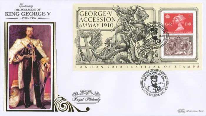 The above Royal Mail King George V: Miniature Sheet were issued on 06 May 2010 by Royal Mail and feature the following stamp designs: 1st Queen Elizabeth & King George V; £1 King George V Downey and Mackennal Heads. The King George V in Coronation Robes first day cover with the London SW1, King George V, Special Handstamp postmark has been produced by Benham and features these stamps which can make a very collectible and lovely gift.