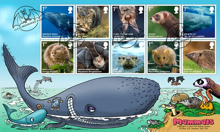The above Royal Mail Mammals were issued on 13 April 2010 by Royal Mail and feature the following stamp designs: 1st Humpback Whale; 1st Wildcat; 1st Brown Long-eared Bat; 1st Polecat; 1st Sperm Whale; 1st Water Vole; 1st Greater Horseshoe Bat; 1st Otter; 1st Dormouse; 1st Hedgehog. The Whale of a time first day cover with the Mousehole, Cornwall, Bat, Special Handstamp postmark has been produced by Steve Oliver and features these stamps which can make a very collectible and lovely gift.