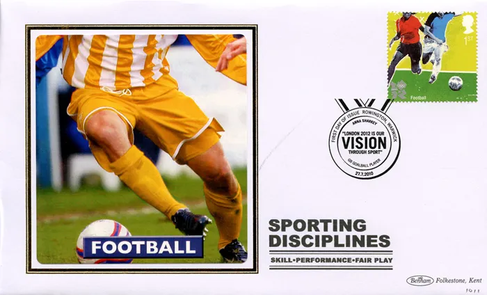 The above Royal Mail Olympic Games: Series No.2 were issued on 27 July 2010 by Royal Mail and feature the following stamp designs: 1st Rowing; 1st Shooting; 1st Modern Pentathalon; 1st Taekwondo; 1st Cycling; 1st Table Tennis; 1st Hockey; 1st Football; 1st Goalball; 1st Boxing. The Football first day cover with the Rowington, London 2012 is our Vision, Special Handstamp postmark has been produced by Benham and features these stamps which can make a very collectible and lovely gift.