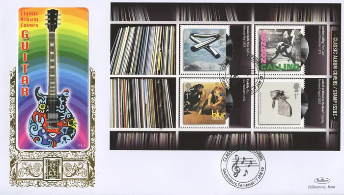 The above Royal Mail PSB: Classic Album Covers - Pane 3 were issued on 07 January 2010 by Royal Mail and feature the following stamp designs: . The Guitar first day cover with the Glastonbury, Sheet Music, Special Handstamp postmark has been produced by Benham and features these stamps which can make a very collectible and lovely gift.