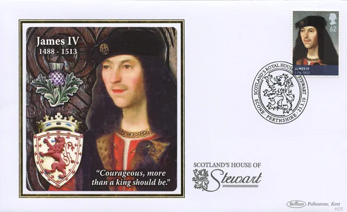 The above Royal Mail The Stewarts were issued on 23 March 2010 by Royal Mail and feature the following stamp designs: 1st James I; 1st James II; 1st James III; 62p James IV; 62p James V; 81p Mary; 81p James VI. The James IV first day cover with the Scone, Scottish Lion, Special Handstamp postmark has been produced by Benham and features these stamps which can make a very collectible and lovely gift.