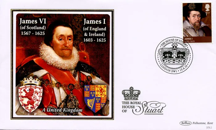 The above Royal Mail The Stuarts were issued on 15 June 2010 by Royal Mail and feature the following stamp designs: 1st James I; 1st CharlesI; 60p Charles II; 60p James II; 67p William III; 67p Mary II; 88p Anne. The James I first day cover with the London SW1, Crown, Special Handstamp postmark has been produced by Benham and features these stamps which can make a very collectible and lovely gift.
