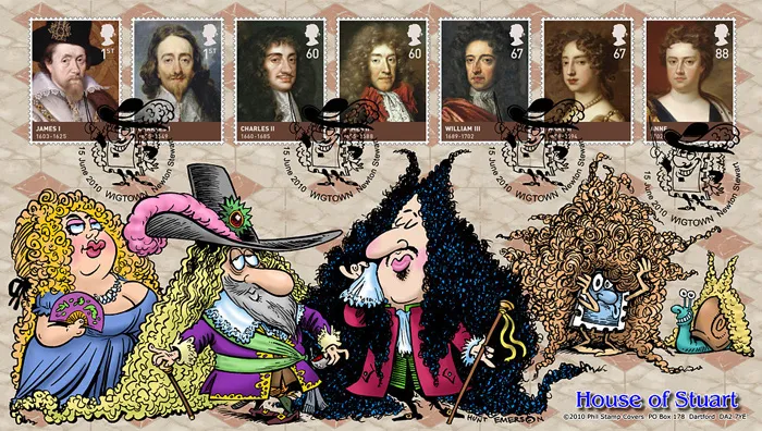 The above Royal Mail The Stuarts were issued on 15 June 2010 by Royal Mail and feature the following stamp designs: 1st James I; 1st CharlesI; 60p Charles II; 60p James II; 67p William III; 67p Mary II; 88p Anne. The Too much hair first day cover with the Wigtown, Phil the Cavalier, Special Handstamp postmark has been produced by Steve Oliver and features these stamps which can make a very collectible and lovely gift.