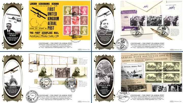 The above Royal Mail PSB: Aerial Post were issued on 09 September 2011 by Royal Mail and feature the following stamp designs: . The The Pilots - set of four first day cover with the Various, Set of four different locations, Special Handstamp postmark has been produced by Benham and features these stamps which can make a very collectible and lovely gift.