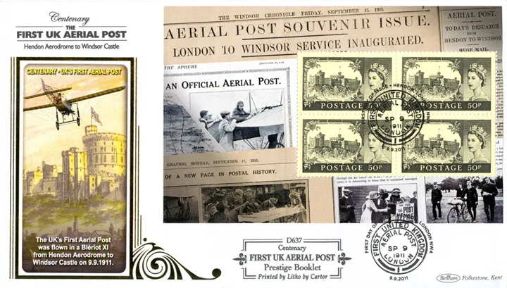 The above Royal Mail PSB: Aerial Post - Pane 4 were issued on 09 September 2011 by Royal Mail and feature the following stamp designs: . The Windsor Castle first day cover with the Hendon, Facsimilie of original postmark, Special Handstamp postmark has been produced by Benham and features these stamps which can make a very collectible and lovely gift.