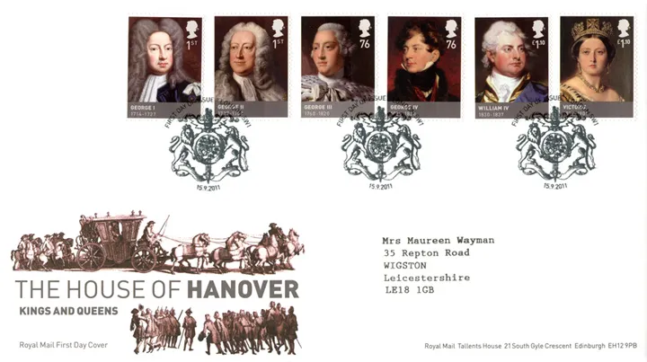 | Stamp Details: | 1st George I 1st George II 76p George III 76p George IV £1.10 William IV £1.10 Victoria |
