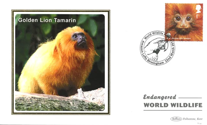 The above Royal Mail WWF were issued on 22 March 2011 by Royal Mail and feature the following stamp designs: 1st African Elephant; 1st Mountain Gorilla; 1st Siberian Tiger; 1st Polar Bear; 1st Amur Leopard; 1st Iberian Lynx; 1st Red Panda; 1st Black Rhinoceros; 1st African Wild Dog; 1st Golden Lion Tamarin. The Golden Lion Tamarin first day cover with the Birmingham, Amazon Lofts, Special Handstamp postmark has been produced by Benham and features these stamps which can make a very collectible and lovely gift.
