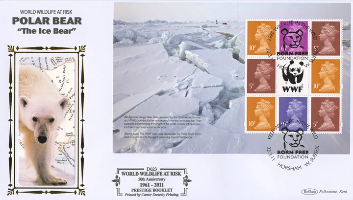 The above Royal Mail PSB: WWF - Pane 3 were issued on 22 March 2011 by Royal Mail and feature the following stamp designs: . The Polar Bear - The Ice Bear first day cover with the Horsham, Born Free Foundation, Special Handstamp postmark has been produced by Benham and features these stamps which can make a very collectible and lovely gift.