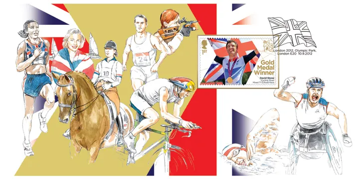| Notes: | These covers showcase the official Royal Mail GB Gold Medal Winners postage stamp franked with official Royal Mail first day of issue postmarks. So that there is no misunderstanding, the envelope designs are my own creation and are NOT official Olympic/Paralympic sponsored designs - hence the lack of official emblems. I am proud of the fact that I have designed my own first day covers for every Royal Mail stamp issue since 1980. I am very pleased with my designs and I hope you like them too. Click here to order the complete set. |