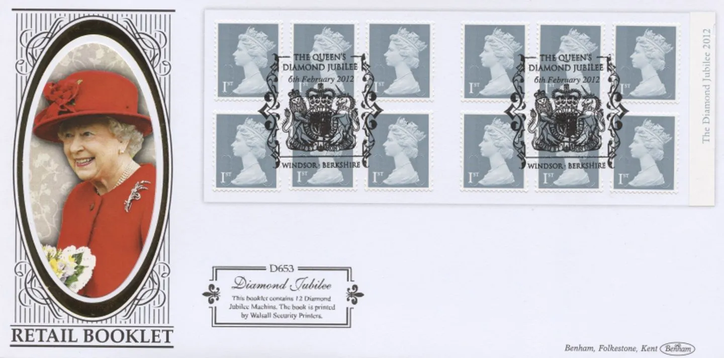 The above Royal Mail Self Adhesive: Diamond Jubilee: 12 x 1st were issued on 06 February 2012 by Royal Mail and feature the following stamp designs: . The HM The Queen first day cover with the Windsor, Special Handstamp postmark has been produced by Benham and features these stamps which can make a very collectible and lovely gift.