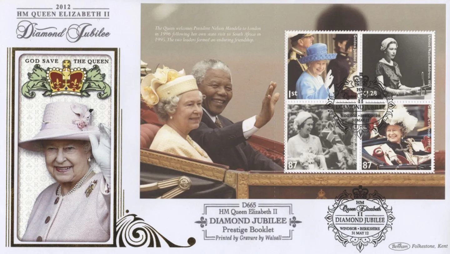 The above Royal Mail PSB: Diamond Jubilee - Pane 3 were issued on 31 May 2012 by Royal Mail and feature the following stamp designs: . The HM The Queen first day cover with the Windsor, Special Handstamp postmark has been produced by Benham and features these stamps which can make a very collectible and lovely gift.