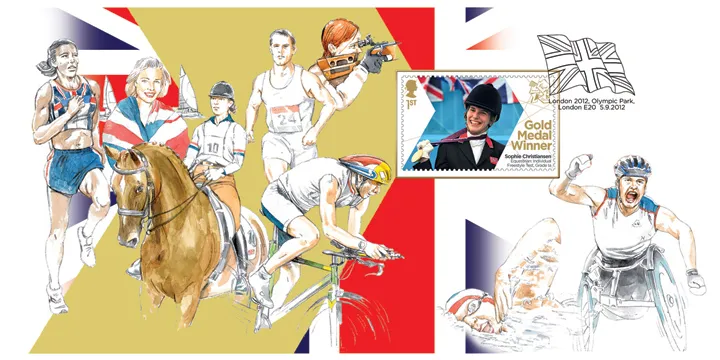 The above Royal Mail Equestrian - Individual Freestyle Test, Grade Ia: Paralympic Gold Medal 21: Miniature Sheet were issued on 05 September 2012 by Royal Mail and feature the following stamp designs: 2 x 1st Sophie Christiansen. The Athletes first day cover with the London, Olympic Park - Union Flag, Special Handstamp postmark has been produced by Bradbury and features these stamps which can make a very collectible and lovely gift.