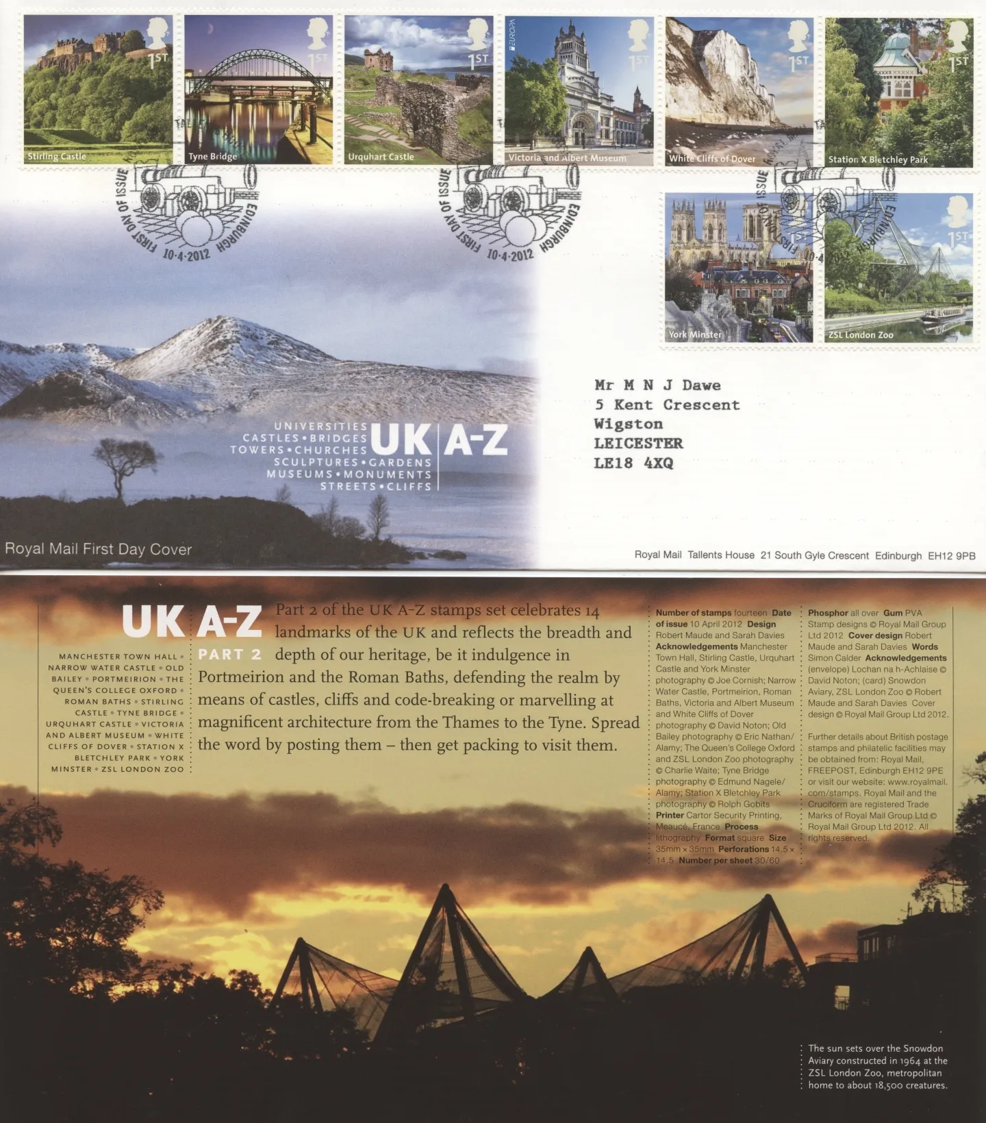 | Stamp Details: | 1st Manchester Town Hall 1st Narrow Water Castle 1st Old Bailey 1st Portmeirion 1st The Queens College Oxford 1st Roman Baths 1st Stirling Castle 1st Tyne Bridge 1st Urquart Castle 1st Victoria & Albert Museum 1st White Cliffs of Dover 1st Station X Bletchley Park 1st York Minister 1st London Zoo |