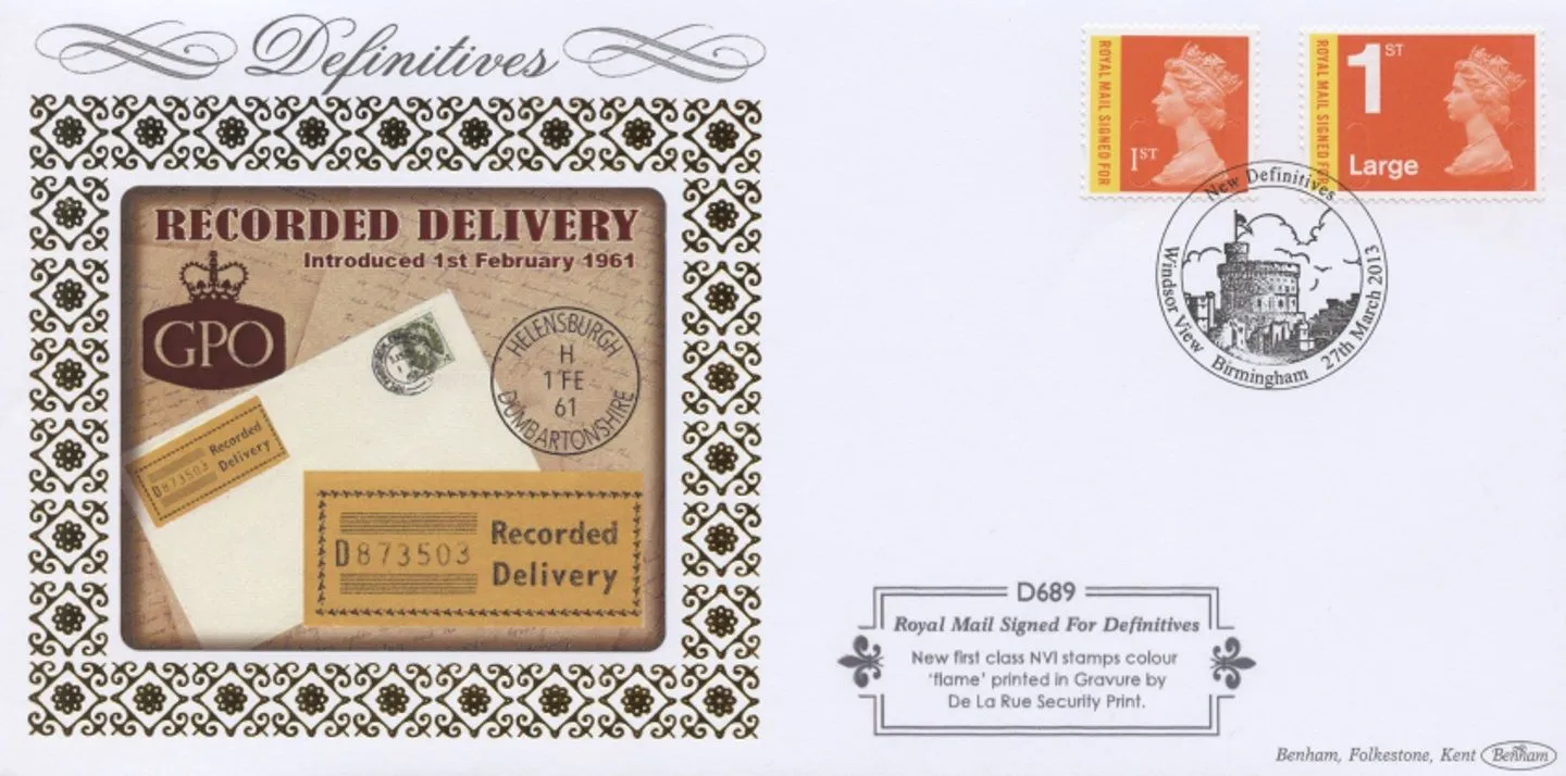 The above Royal Mail Machins (EP): 78p, 88p, 1st & 1st Large Signed For, £1.88 were issued on 27 March 2013 by Royal Mail and feature the following stamp designs: . The Recorded Delivery first day cover with the Windsor View, Special Handstamp postmark has been produced by Benham and features these stamps which can make a very collectible and lovely gift.