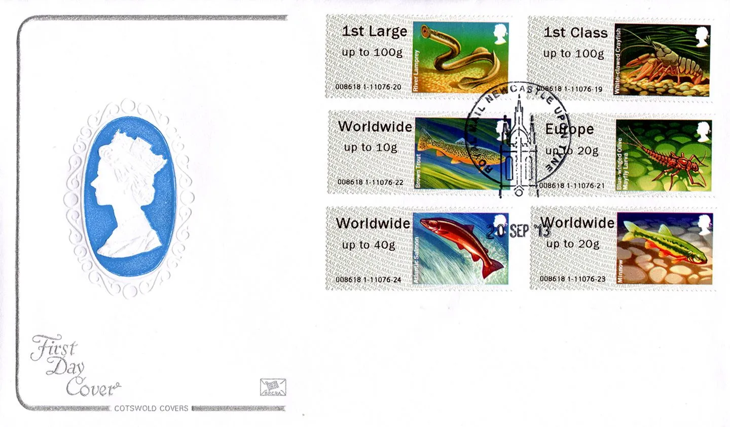 | Stamp Details: | 1st Minnow 1st Atlantic Salmon 1st White-clawed Crayfish 1st River Lamprey 1st Blue-winged Olive Mayfly larva 1st Brown Trout |