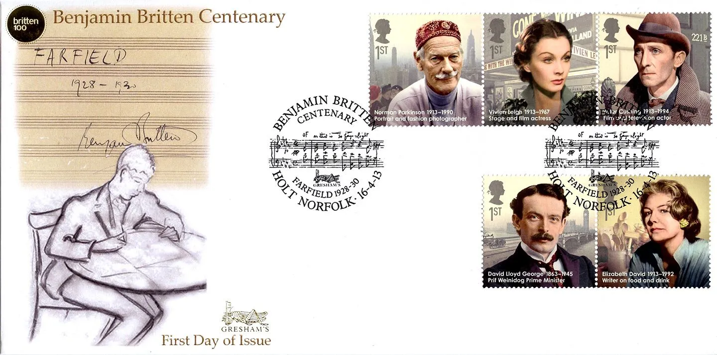 | Stamp Details: | 1st Norman Parkinson 1st Vivien Leigh 1st Peter Cushing 1st David Lloyd George 1st Elizabeth David 1st John Archer 1st Benjamin Britten 1st Mary Leakey 1st Bill Shankly 1st Richard Dimbleby |