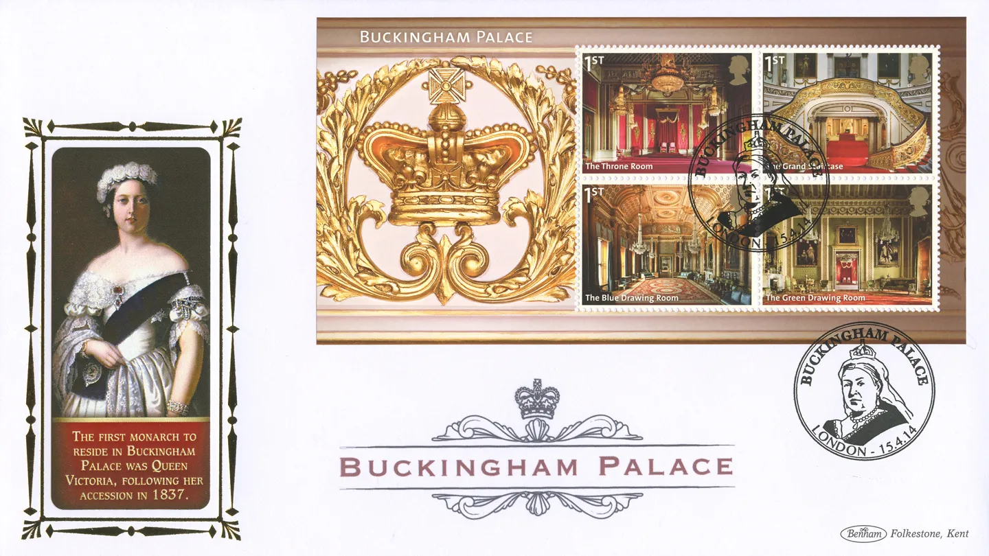 The above Royal Mail Buckingham Palace: Miniature Sheet were issued on 15 April 2014 by Royal Mail and feature the following stamp designs: 1st The Throne Room; 1st The Grand Staircase; 1st The Blue Drawing Room; 1st The Green Drawing Room. The Queen Victoria first day cover with the London, Queen Victoria, Special Handstamp postmark has been produced by Benham and features these stamps which can make a very collectible and lovely gift.