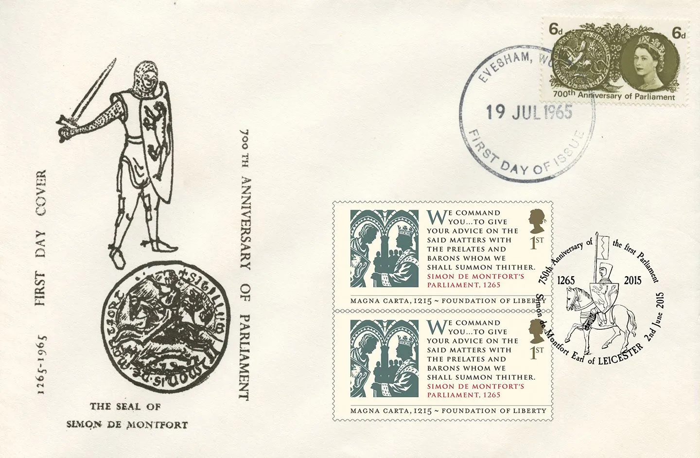 | Notes: | This cover was issued 50 years ago in 1965 when the Post Office issued stamps to mark the 700th anniversary of the English Parliament. I have a few of these covers remaining (different designs) to which I have added the new Simon DeMontfort's postage stamp now issued for the 750th anniversary. These items are highly collectable. This cover was produced by HOLMES TOLLEY - a very scarce design. The 1965 postmark is Evesham - Simon DeMontfort died at the Battle of Evesham - You cannot get a better cover! |