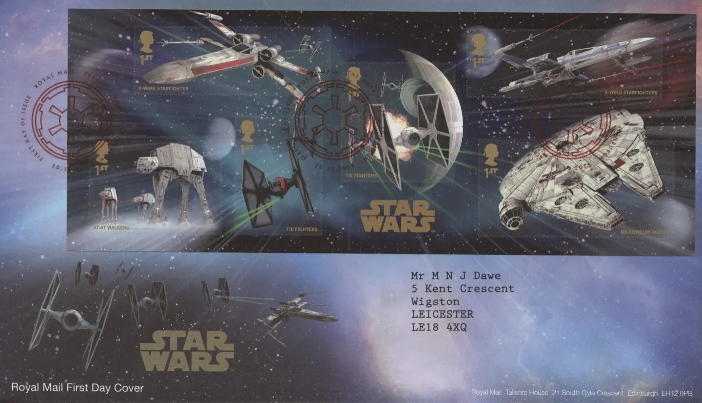 | Notes: | NB PRICE INCLUDES 1st CLASS POSTAGE & PACKING IN A STIFFENED OUTER ENVELOPE AND STIFFENER This Royal Mail stamp issue marks the release of the latest instalment in the Star Wars series of films. December 2015 will herald a massive global phenomenon with the much anticipated release of Star Wars Episode VII – The Force Awakens due for release in Britain on 17th December 2015 followed by the USA one day later on the 18th December. All Star Wars fans will be fully aware of the strong British connections with the franchise starting with Star Wars itself which was filmed at Elstree Studios, near London. Many of the other films were also filmed in Britain and Episode VII – the Force Awakens is no exception having been filmed at Pinewood Studios, London and on location at the Forest of Dean in Gloucester.