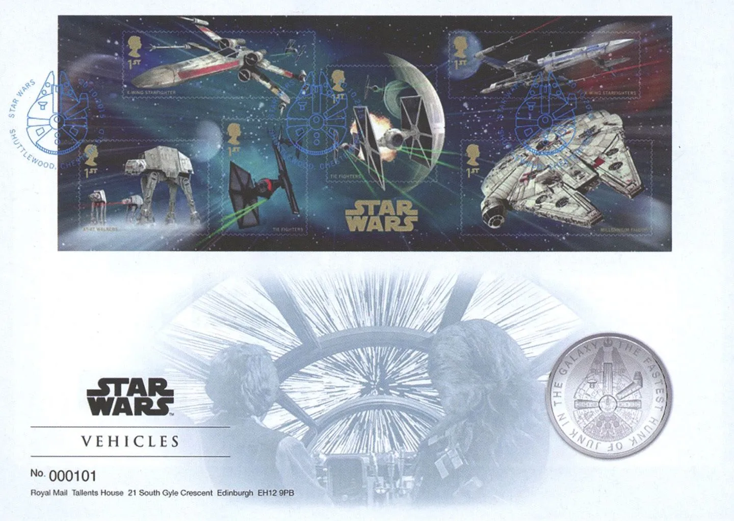 The above Royal Mail Star Wars: Miniature Sheet were issued on 20 October 2015 by Royal Mail and feature the following stamp designs: 1st Resistance X-Wing Starfighter; 1st TIE fighters; 1st X-wing Starfighters; 1st AT-AT Walkers; 1st First Order Special Forces Tie Fighters; 1st Millennium Falcon. The Star Wars Vehicles first day cover with the Shuttlewood, Special Handstamp postmark has been produced by Royal Mint and features these stamps which can make a very collectible and lovely gift.