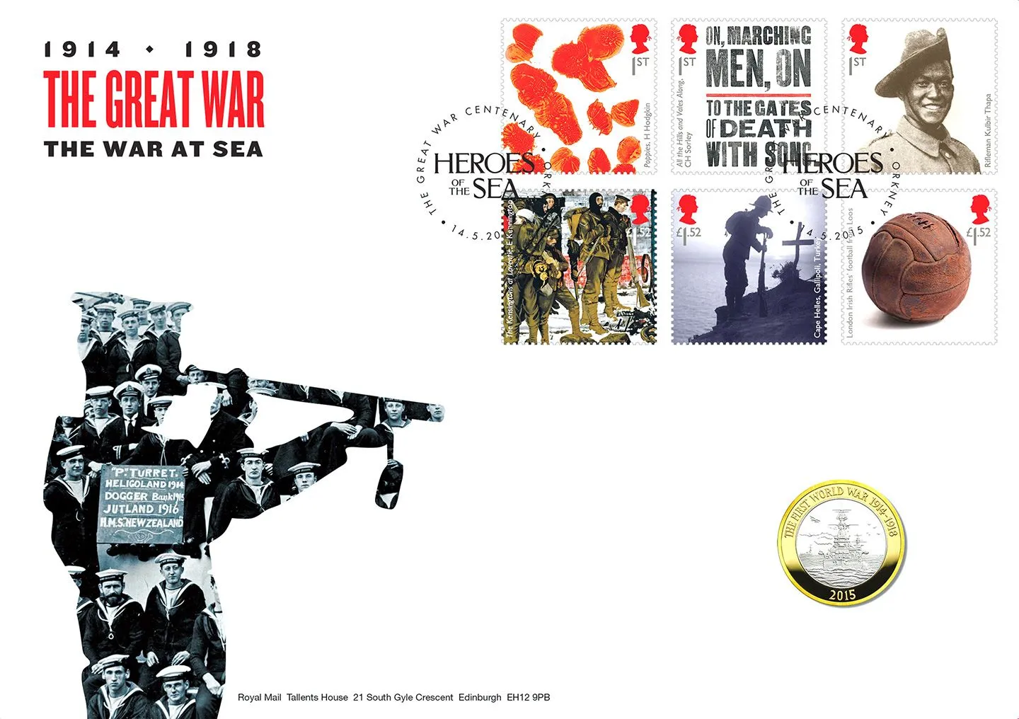 The above Royal Mail The Great War were issued on 14 May 2015 by Royal Mail and feature the following stamp designs: 1st Poppy; 1st Poetry; 1st Portrait; £1.52 War Art; £1.52 War Memorial; £1.52 Artefacts. The The War at Sea first day cover with the Orkney, Heroes of the Sea, Special Handstamp postmark has been produced by Royal Mint and features these stamps which can make a very collectible and lovely gift.