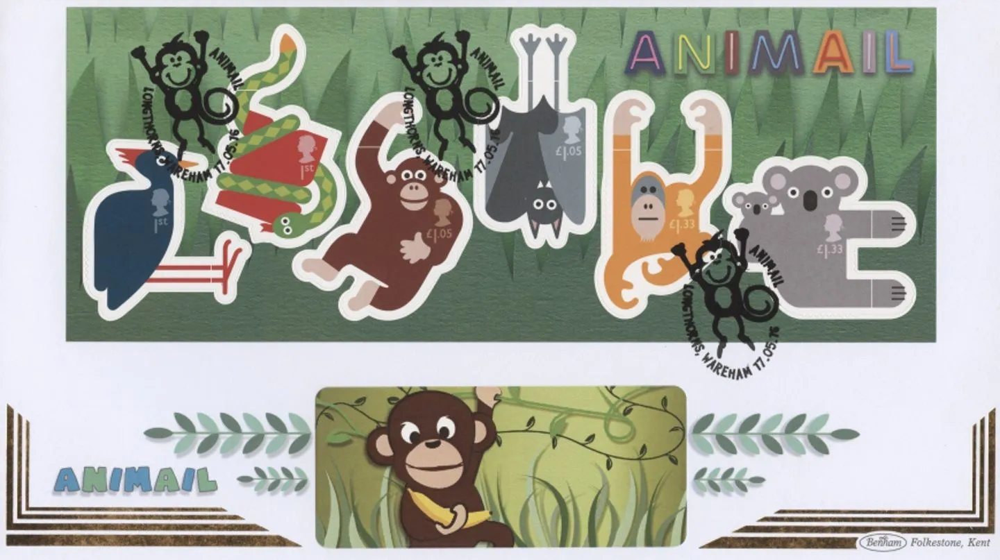 The above Royal Mail Animail: Miniature Sheet were issued on 17 May 2016 by Royal Mail and feature the following stamp designs: 1st Woodpecker; 1st Snake; £1.05 Chimpanzee; £1.05 Bat; £1.33 Orangutan; £1.33 Koala. The Monkey with Banana first day cover with the Wareham, Special Handstamp postmark has been produced by Benham and features these stamps which can make a very collectible and lovely gift.