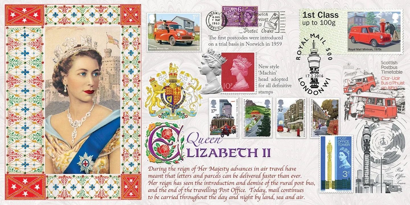 The above Royal Mail Royal Mail Heritage were issued on 17 February 2016 by Royal Mail and feature the following stamp designs: 1st Post Boy; 1st Mail Coach; 1st Falmouth Packet Ship; 1st Travelling Post Office; 1st Airmail; 1st Royal Mail Minivan. The Queen Elizabeth - Royal Mail Vehicles first day cover with the Tallents House, Post & Go 2016, Special Handstamp postmark has been produced by Bradbury and features these stamps which can make a very collectible and lovely gift.