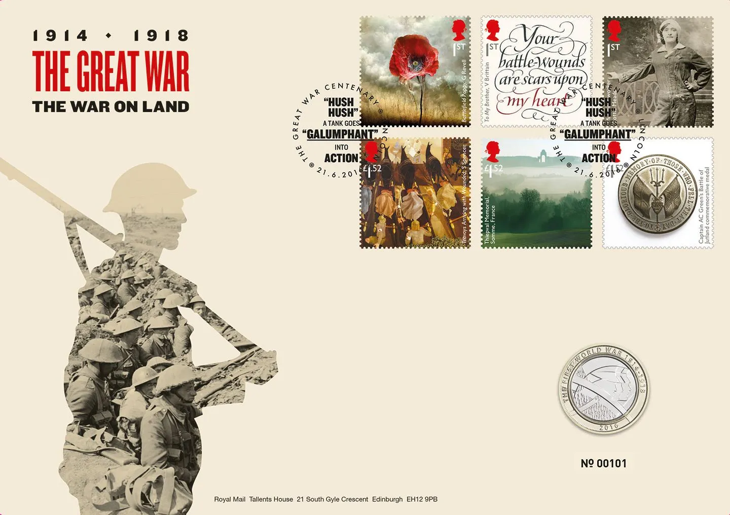 The above Royal Mail The Great War were issued on 21 June 2016 by Royal Mail and feature the following stamp designs: 1st Poppy; 1st Poetry; 1st Portrait; £1.52 War Art; £1.52 War Memorial; £1.52 Artefacts. The Soldier with Rifle first day cover with the Lincoln, Hush Hush Galumphant, Special Handstamp postmark has been produced by Royal Mint and features these stamps which can make a very collectible and lovely gift.