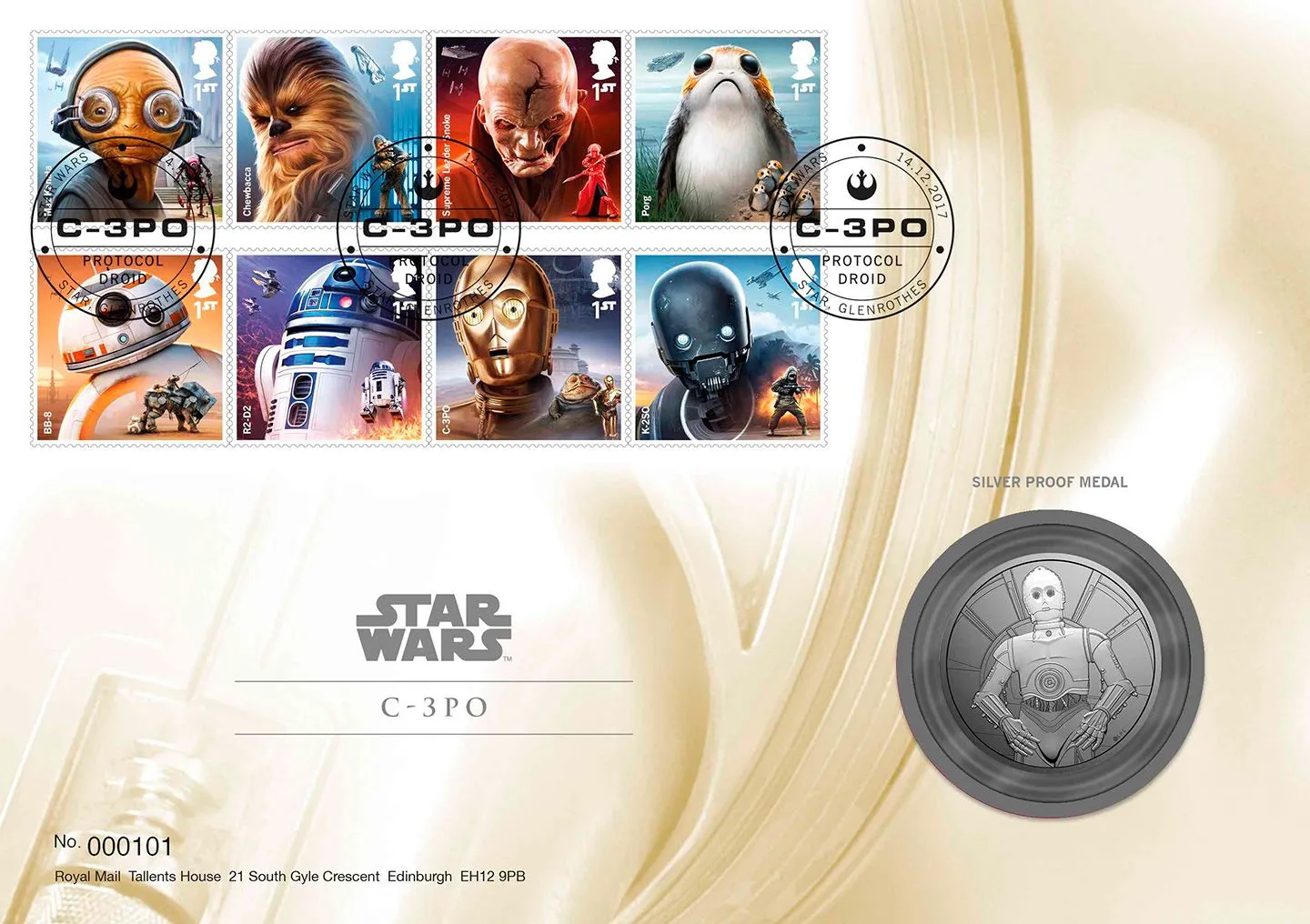 The above Royal Mail PSB: Star Wars Last Jedi were issued on 14 December 2017 by Royal Mail and feature the following stamp designs: . The C-3PO Medal Cover first day cover with the Star, C-3PO, Special Handstamp postmark has been produced by Royal Mint and features these stamps which can make a very collectible and lovely gift.